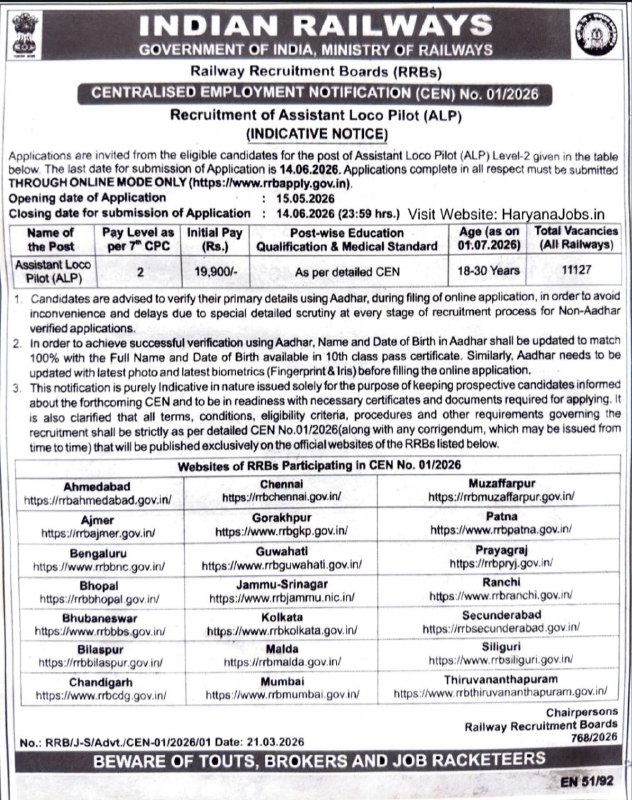 Short Information: The Railway Recruitment Board (RRB) has released a short notification for the recruitment of Assistant Loco Pilot (ALP) posts against Centralized Employment Notice (CEN 01/2026). This is a massive opportunity for railway job aspirants, with approximately 11,127 vacancies available across various RRB zones. Eligible and interested candidates can apply online starting from 15th May 2026. Please read the complete details below regarding age limit, selection procedure, syllabus, and eligibility criteria before applying.